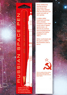 Cuando la NASA comenzó con sus proyectos de vuelos espaciales se encontraron con un problema, los bolígrafos convencionales usaban la gravedad para escribir, así que eran inútiles en el espacio exterior. ¿Que es lo que hicieron entonces? pues fácil, se gastaron millones de dólares en desarrollar un bolígrafo que fuera capaz de escribir en gravedad cero. Los rusos mientras tanto decidieron usar un lápiz«.